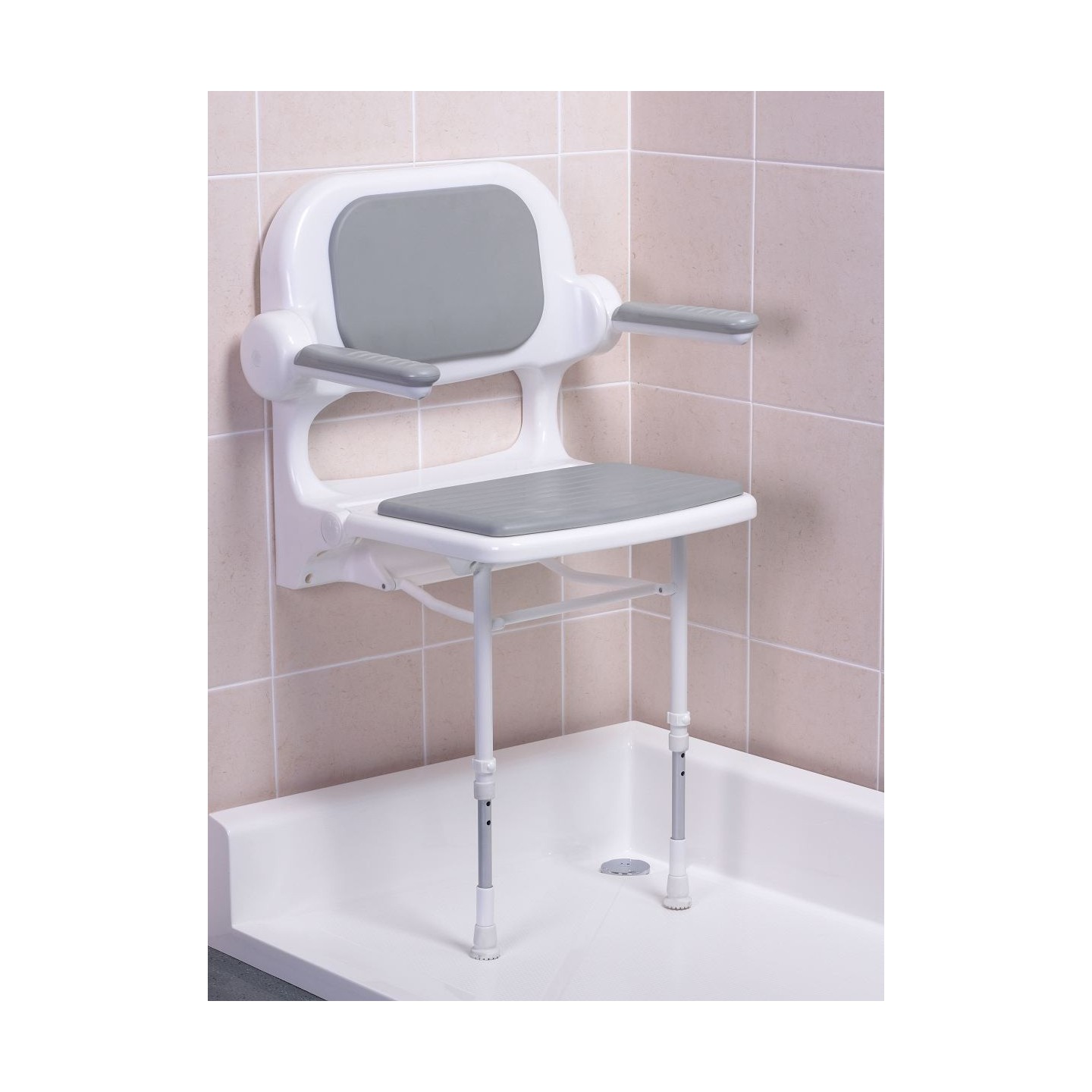 L'ensemble se relève contre le mur pour laisser l'espace de la douche aux autres utilisateurs. L'assise amovible est rembourrée.