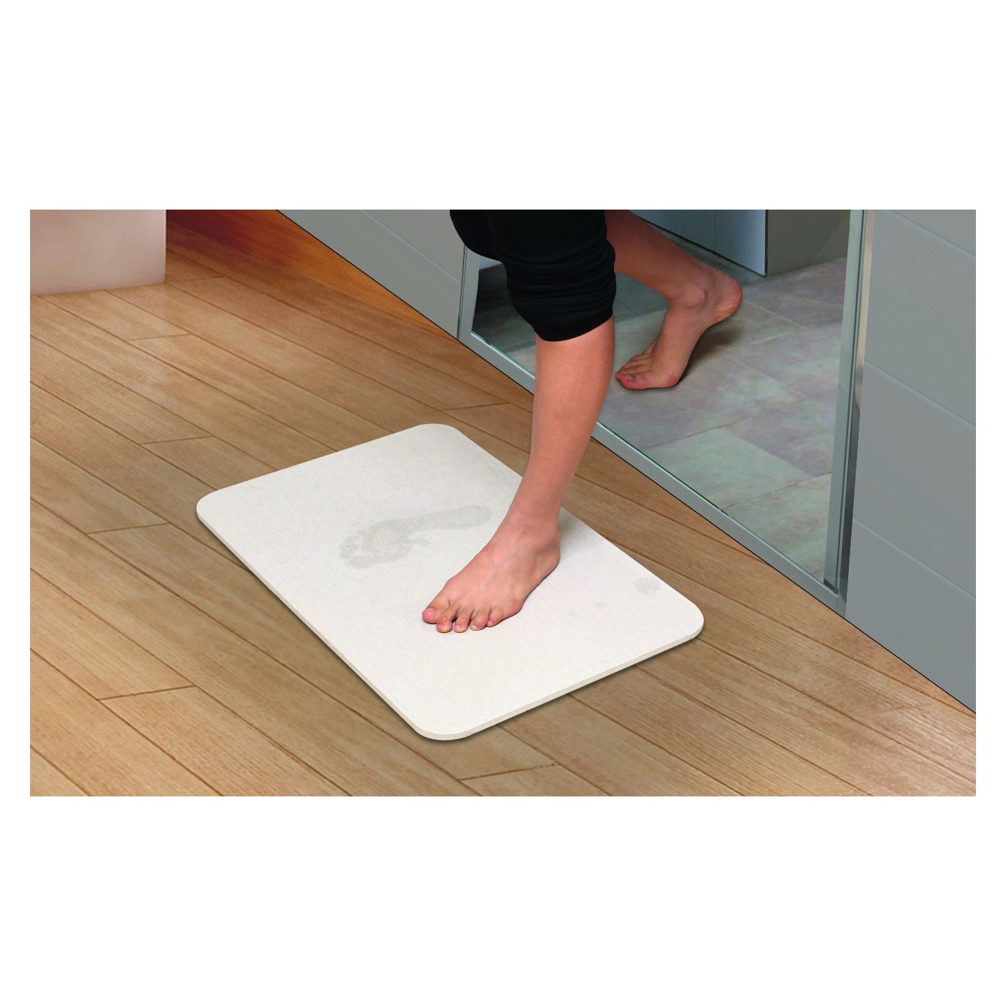 Il assèche instantanément la plante du pied et permet ainsi de sécuriser la sortir de la douche ou de la baignoire.