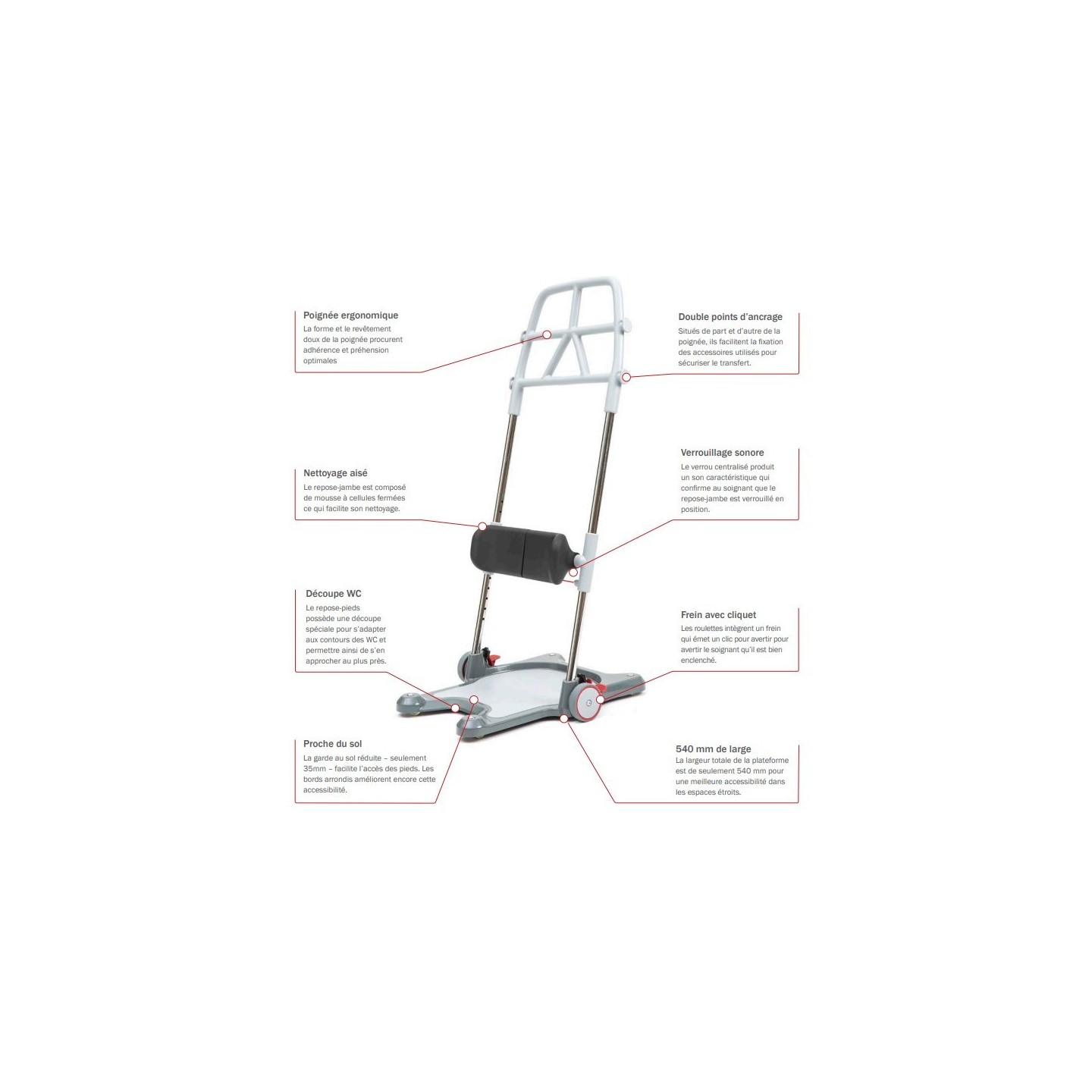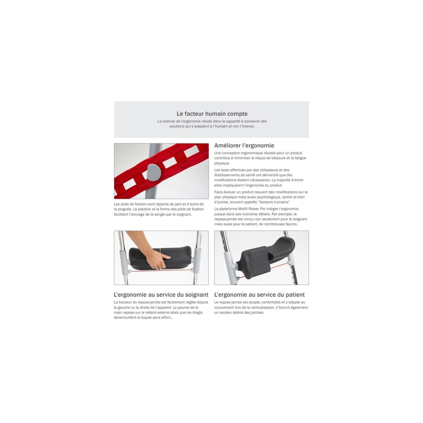La conception du Molift Raiser Pro se concentre sur l’ergonomie et la prévention des risques pour optimiser la verticalisation et le transfert du patient.