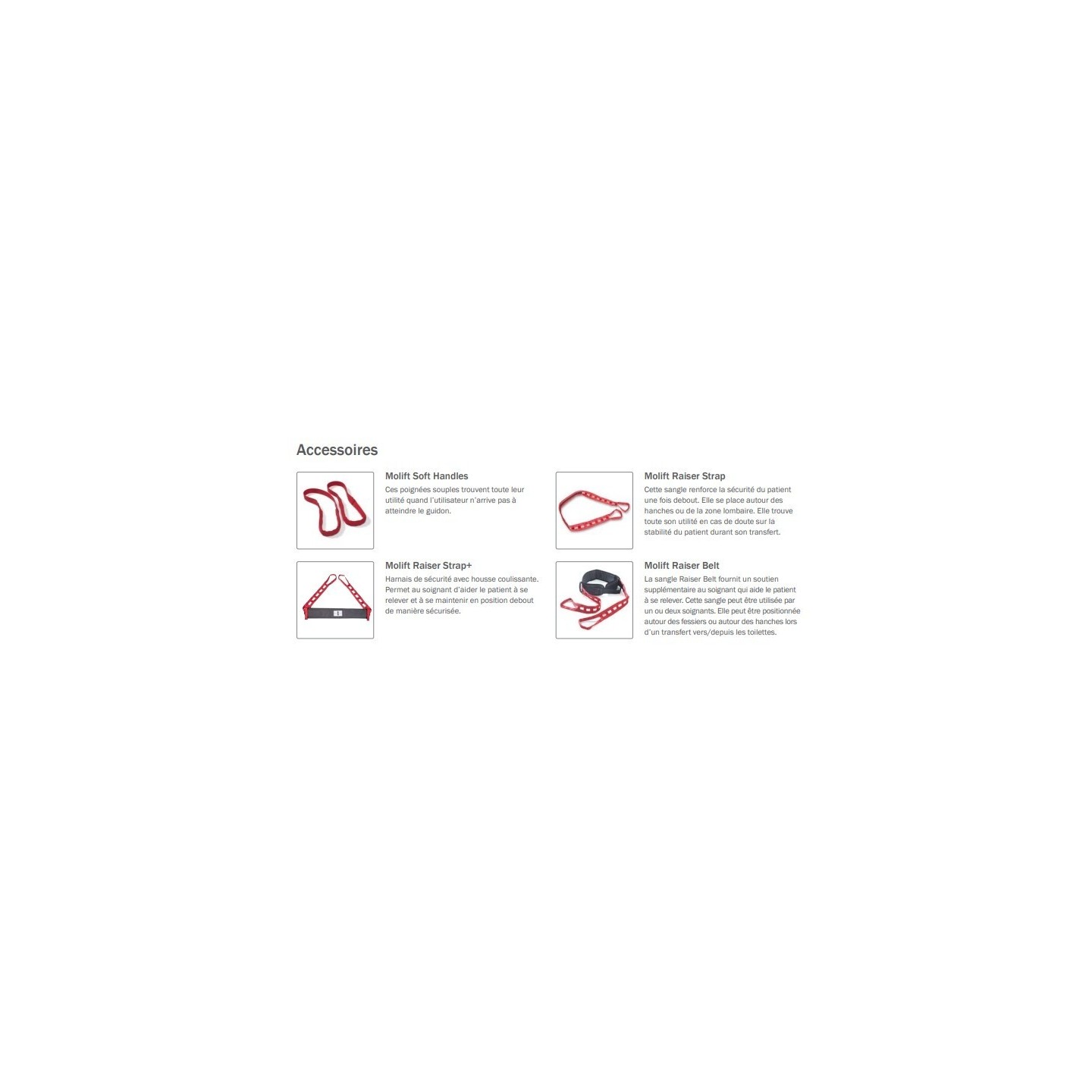 | Molift Raiser Strap Cette sangle renforce la sécurité du patient une fois debout. Elle se place autour des hanches ou de la zone lombaire. Elle trouve toute son utilité en cas de doute sur la stabilité du patient durant son transfert. |
