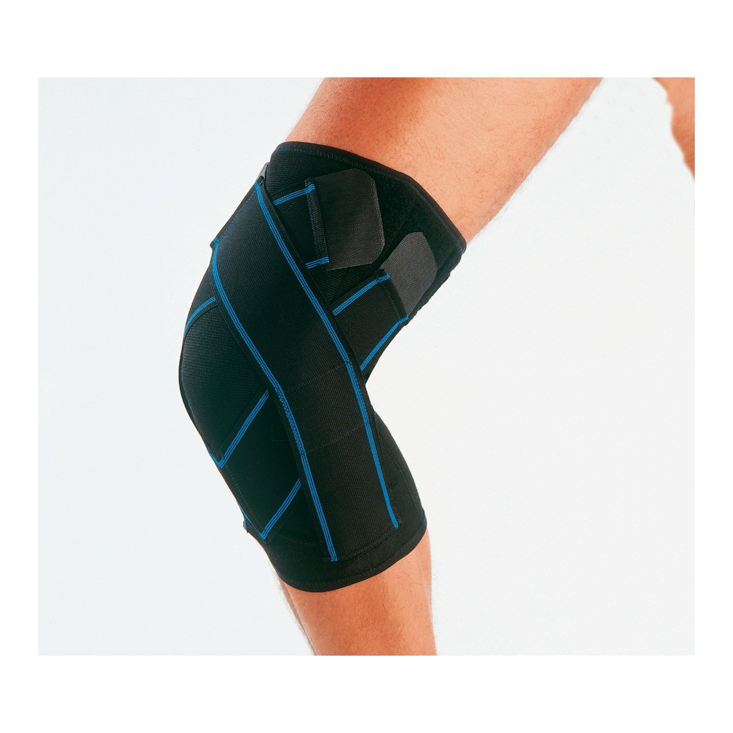 Genouillère ligamentaire en prévention ou en traitement de douleurs ou de lésions ligamentaires du genou qu'elles soient chronique ou aigues.