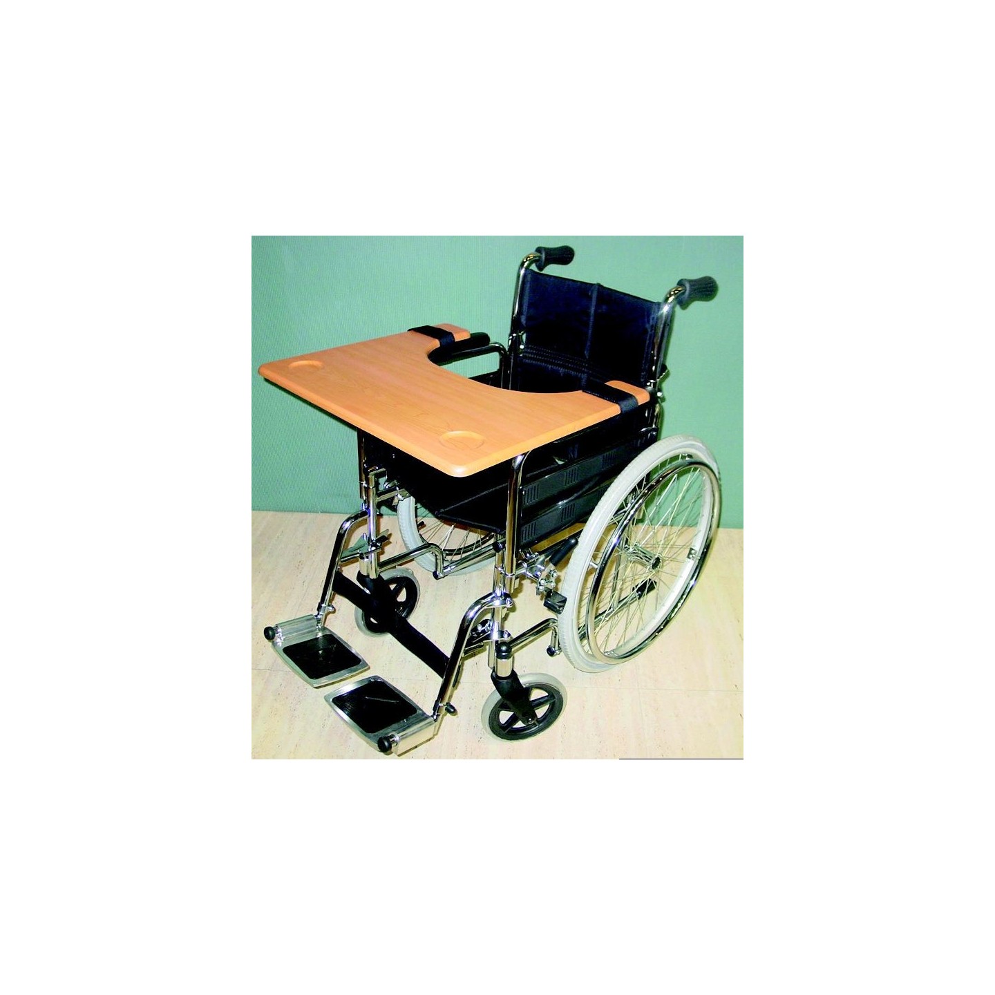 Tablette universelle pour fauteuil à fixer sur les accoudoirs grâce à 2 bandes velcro. 2 espaces creusés pour placer des verres. Dessus mélaminé imitation poirier.