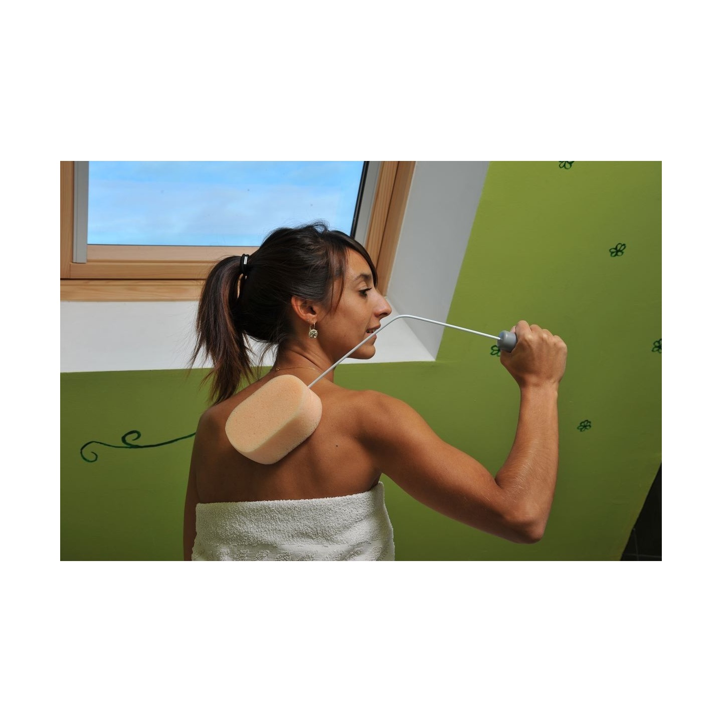 Le manche est déformable pour pouvoir se laver le dos confortablement. Le manche est en acier avec une poignée plastifiée. Eponge très douce. Longueur : 55 cm.