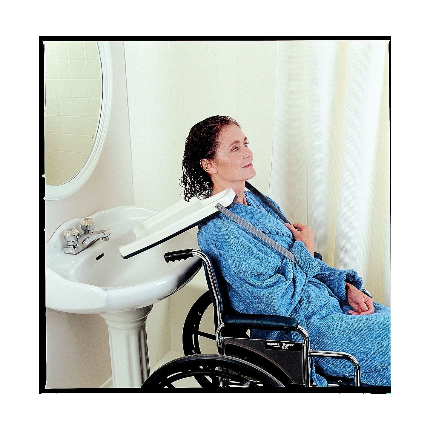 Ce plateau lave tête permet de faire plus facilement un shampooing à une personne qui est en fauteuil.