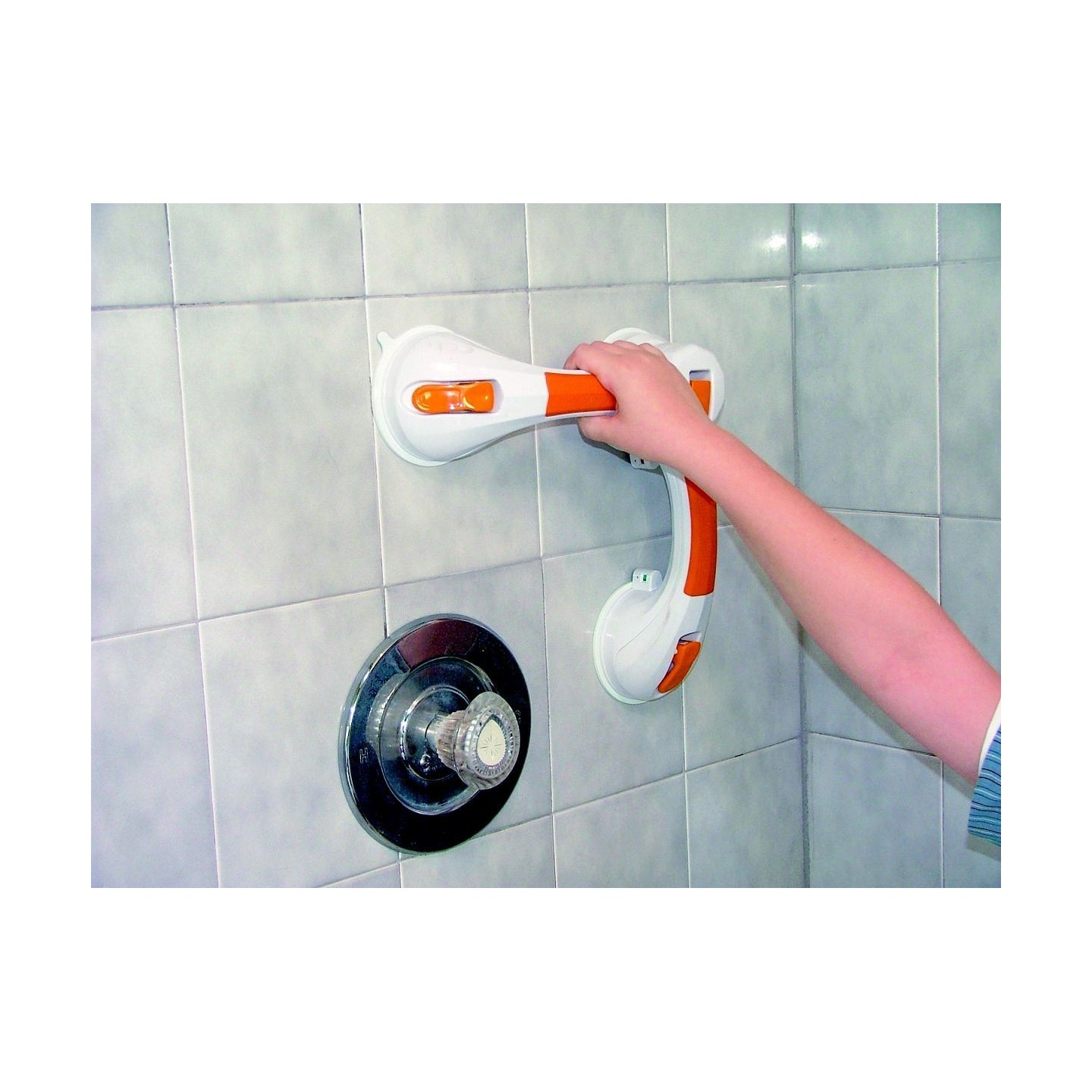 Cette poignée double à ventouses peut être installée droite sur un mur pour une sortie de douche, inclinée à l'angle souhaité pour une utilisation vers les toilettes, ou sur le bord d'une baignoire pour aider à entrer et sortir de la baignoire.