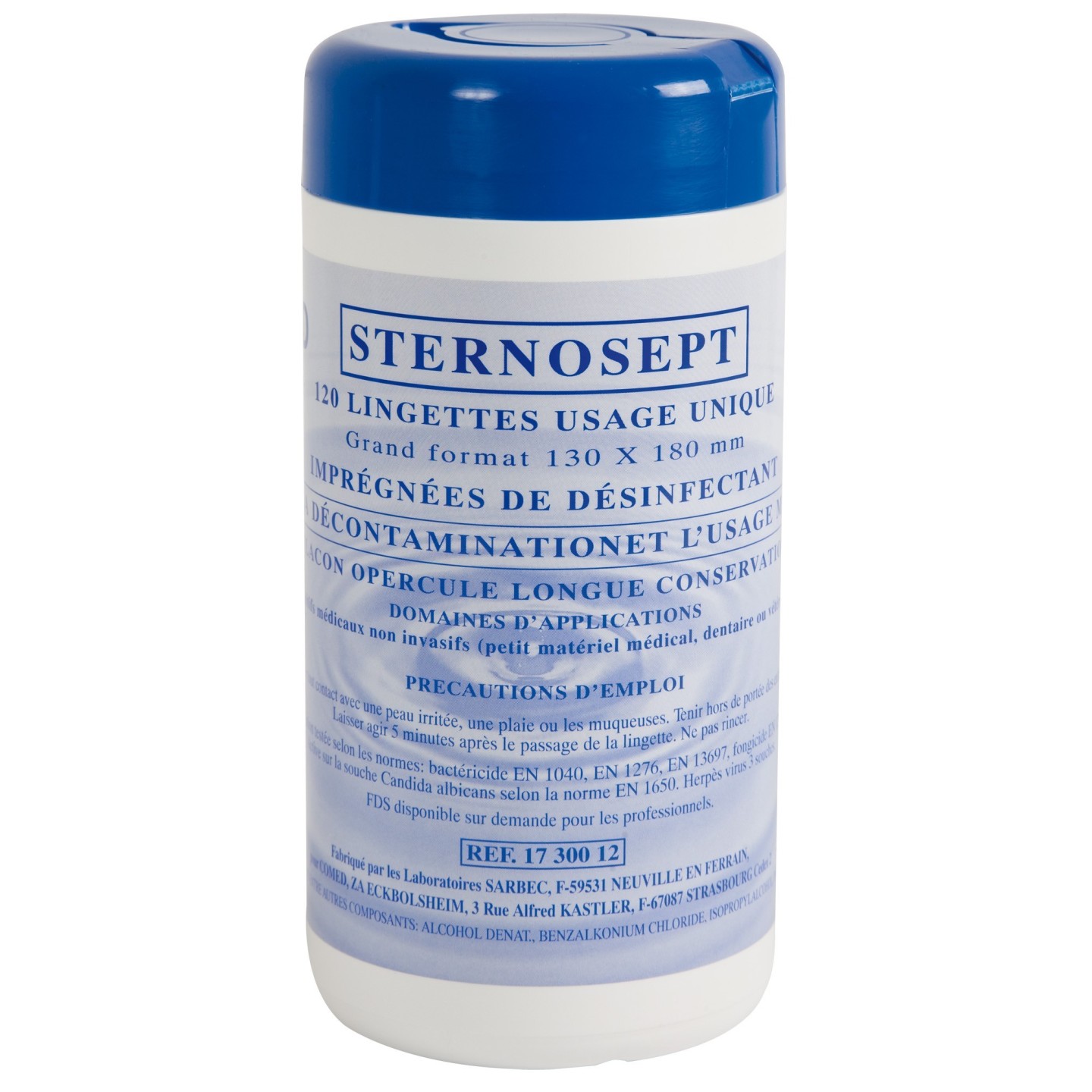 FLACON DE 120 LINGETTES DÉSINFECTANTES À USAGE UNIQUE.