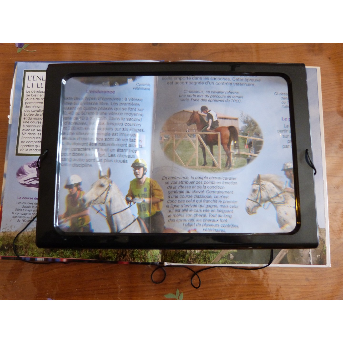 Loupe sur pieds. Dimensions 23 cm X 16 cm, cadre noir PVC au dos duquel sont fixés 4 pieds repliables de 10 cm de hauteur.