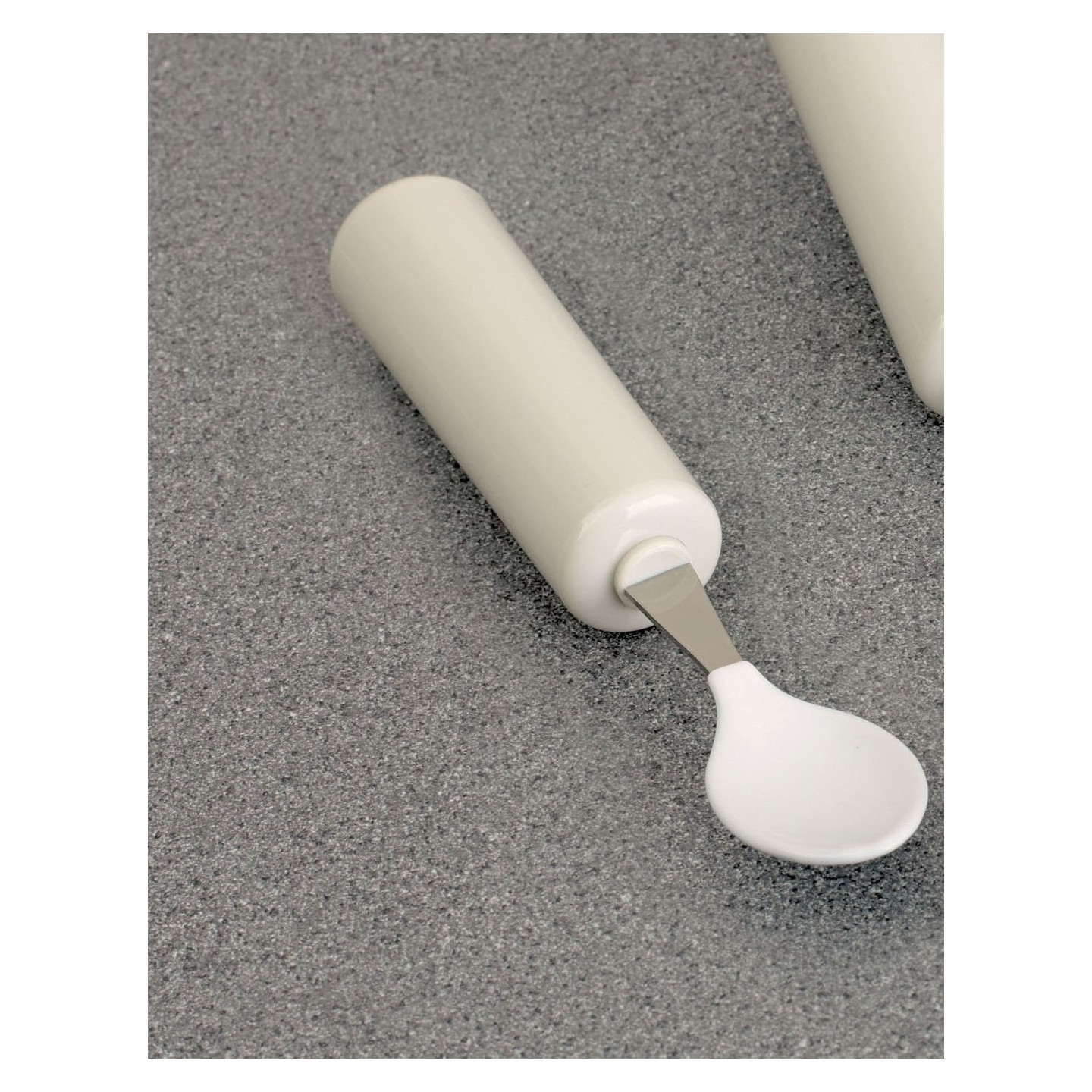 Cette cuillère à café a un revêtement alimentaire en PVC et elle est montée sur un manche plastique.