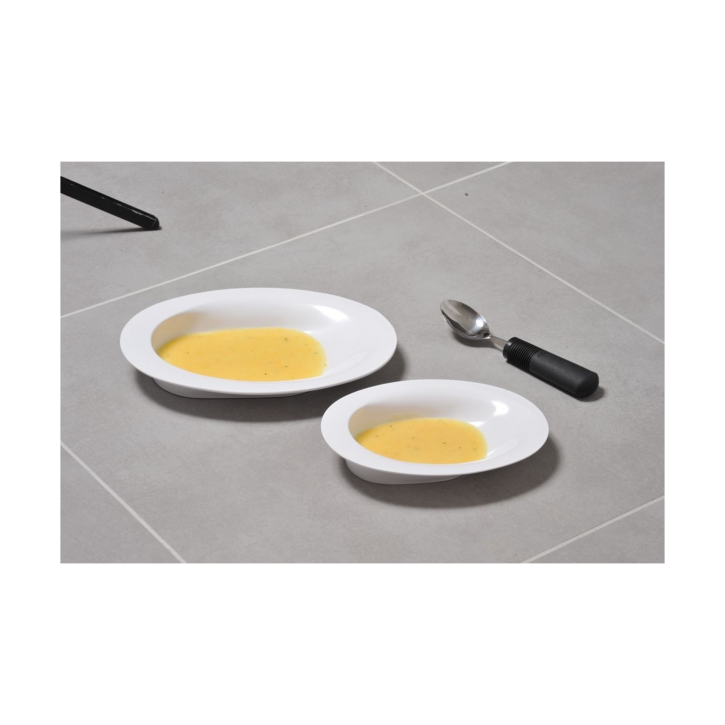Bord surélevé sur le fond et inclinaison pour pousser et collecter plus facilement les aliments avec l'usage d'une seule main.