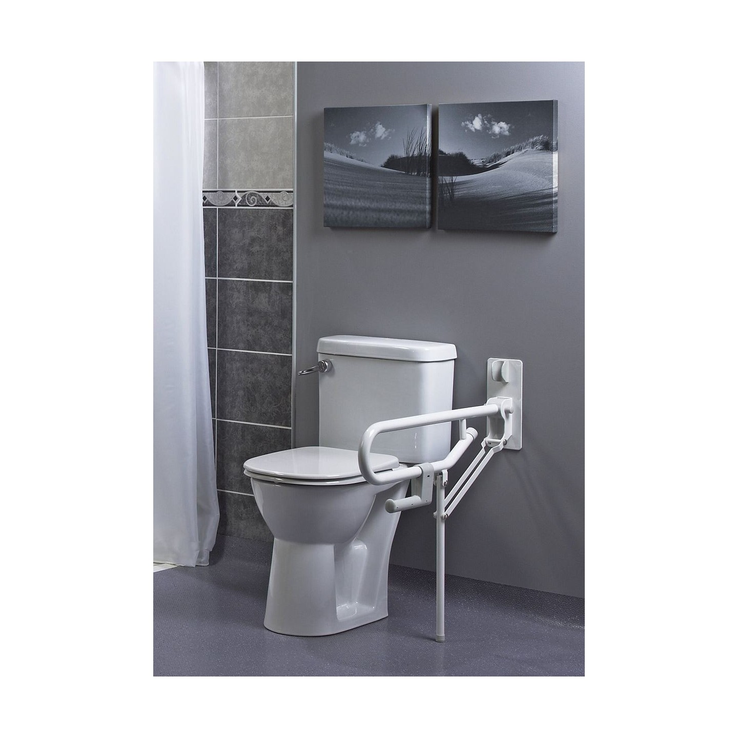 Cette barre permet de s'asseoir et se relever facilement des toilettes, en toute sécurité.