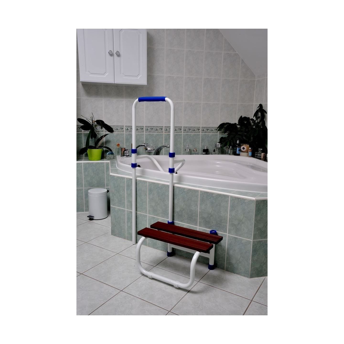 Cet ensemble complet d’accès au bain comprend un marche pied pour entrer et sortir plus facilement de la baignoire, ainsi qu’une barre d’accès avec deux appuis en positions haute et basse pour vous tenir, vous asseoir, vous relever. Très simple à installer car ne nécessite aucun outillage. La barre d’appui peut se positionner à gauche ou à droite du marche pied. L’appui se règle également en hauteur. La structure est en acier epoxy blanc