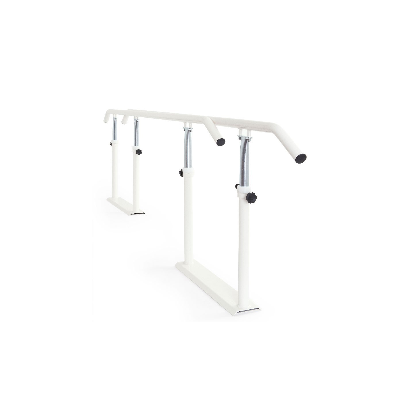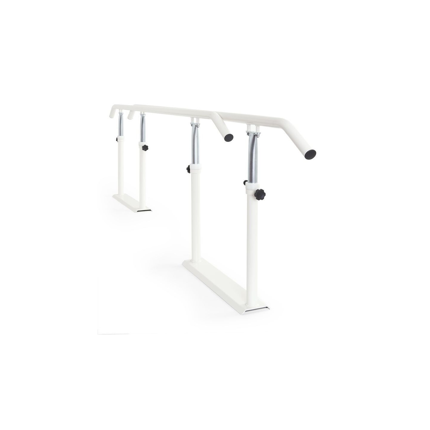 Idéales pour les espaces réduits. Barres de marche repliables contre le mur en position de rangement. Structure autostable en acier epoxy blanc, main courante en inox recouvert de PVC réglable en hauteur de 69 à 100 cm. Garantie 3 ans. Longueur : 3,00 m